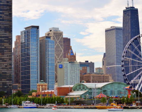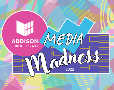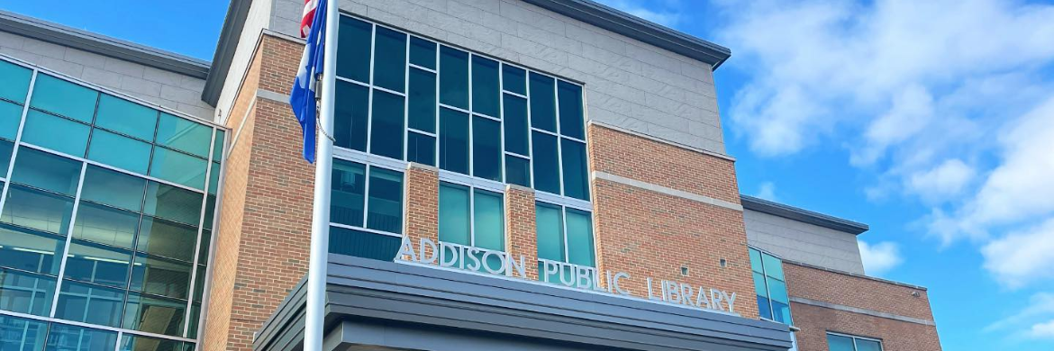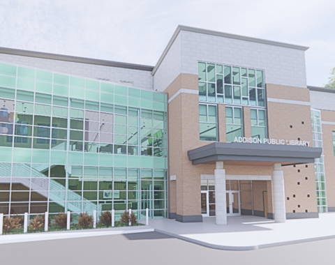 Rendering of the Addison Public Library's modern exterior, featuring a large glass facade and entrance with the library's name displayed above.