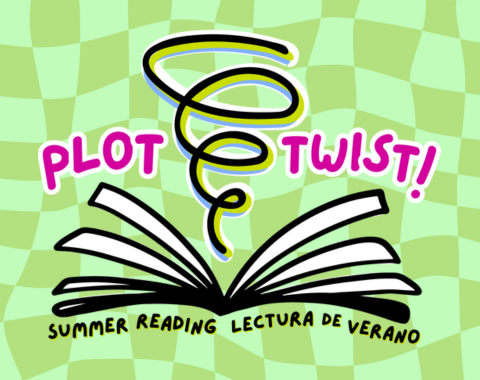 illustration of blue shopping basket with a can of beans and peas popping out of the top. text: addison public library food drive