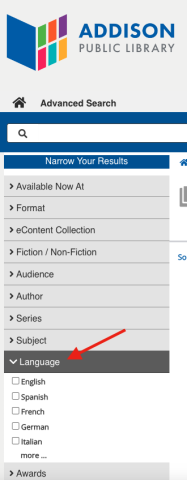 When searching our catalog, there is a “Narrow Your Results” menu on the left. Click on the “Language” drop-down menu. You will get a list of languages to search. Use the “more…” button to get the full languages available from SWAN libraries.